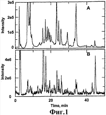 Фиг.1 показывает хроматографический профиль в ультрафиолетовом свете (UV) и в общем потоке ионов экстракта какао-порошка из ядер (CNP) ферментированных в течение 5 дней какао-бобов, полученный комбинированным методом обращенно-фазной жидкостной хроматографии высокого разрешения/масс-спектрометрии с ионизацией электрораспылением (RP-HPLC/ESI-MS).