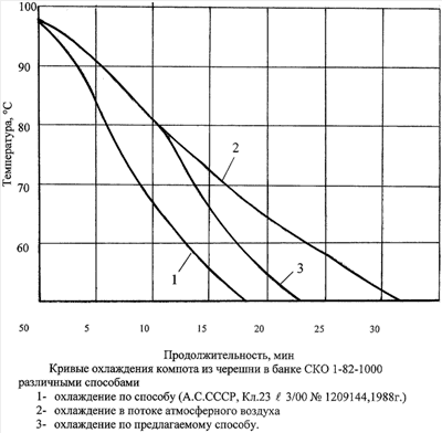 Вращающуюся банку с продуктом (компот из черешни в банке СКО 1-82-1000) после тепловой стерилизации подвергают охлаждению в потоке атмосферного воздуха температурой 32°С в течение 10 минут до снижения температуры продукта в банке до 80°С. Далее на поверхность банки попеременно с интервалом 5-10 с наносят водяную пленку температурой 65-70°С и продолжают охлаждать до требуемой температуры.