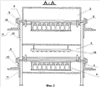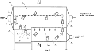 Аппарат состоит из каркаса 1, на котором закреплены секции подогрева 2 и охлаждения 3, двух роликово-втулочных цепей 4, натянутых на звездочки 5, к которым шарнирно закреплены носители 6 для банок 7. На концы валов 8 носителей банок надеты ступенчатые шкивы 9, которые, касаясь направляющих 10, сообщают носителям банок вращательное движение. При этом направляющие 10 выполнены таким образом, что их можно перемещать относительно упорных уголков 11 в горизонтальном направлении, чем достигается контакт рабочей поверхности направляющих с одной из ступеней шкивов за счет перемещения упорных уголков вместе с направляющими в вертикальной плоскости относительно стойки 12. К секции подогрева с торцевых сторон закреплены распределители для горячего воздуха 13 и обработанного воздуха 14, а к секции охлаждения, внутри которой установлены разбрызгиватели воды 18, закреплен распределитель для подачи атмосферного воздуха 15. Аппарат снабжен загрузочно-разгрузочным узлом с отводящим транспортером 16 и подводящим транспортером 17.