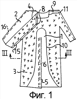 Одежда для больного, изображенная на фиг. 1 и 3, выполнена в виде халата, включающего переднюю деталь 1 и заднюю деталь 2. Передняя деталь 1 содержит наружный слой 3 из материала, обладающего низкой воздухопроницаемостью, или из воздухонепроницаемого материала и внутренний слой 4 из материала, обладающего значительно более высокой, чем наружный слой, воздухопроницаемостью. Кроме того, передняя деталь содержит центральный разрез 5, проходящий от нижнего края передней детали до уровня грудной части. Части передней детали, расположенные с каждой стороны разреза, соединены друг с другом внахлест с помощью соединительных средств, которые можно разъединять и повторно соединять, предпочтительно с помощью так называемых соединительных средств типа Velcro, т.е. соединительных средств, включающих охватываемый элемент 6, содержащий ряд выступающих крючкообразных элементов, и охватывающий элемент 7, содержащий ряд петель или подобных структур, с которыми сопрягают крючкообразные элементы, когда эти элементы сводят друг с другом. Внутренний слой 4 соединен с наружным слоем 3 в редко расположенных точках посредством склеивания или сварки по большей части передней детали. Кроме того, к передней детали в каждой плечевой части присоединены впуски 8, 9 для подачи воздуха, причем упомянутые впуски проложены между внутренним и наружным слоями. Впуски, которые не используют, закрывают соответствующим образом, например, впуски могут быть изготовлены в виде трубчатых тел, которые перегибают и герметически закрывают отрезками клейкого материала или снабжают простыми бумажными или пластиковыми укупорочными средствами. Внутренний и наружный слои герметически соединены друг с другом по краям передней детали и вдоль линии 10, расположенной на расстоянии от разреза 5, и линии 11, проходящей вокруг ворота. Воздух, который подают по каждому из впусков 8 или 9, таким образом, может поступать только в пространство между внутренним и наружным слоями в область, где эти слои соединены друг с другом с помощью редко расположенных точек соединения, выполненных путем склеивания или сварки.