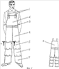 Каждая левая и правая половины брюк имеют три горизонтально расположенных сечения: верхнее находится в пределах 10-12 см выше уровня колена, среднее – в пределах 14-16 см ниже уровня колена, а нижнее – посередине от среднего сечения до низа брюк. Таким образом, каждая половина брюк состоит из 4 частей. Каждая верхняя часть половины брюк имеет вид усеченного конуса с расширением книзу и при соединении заходит на 5-7 см на узкое основание последующей нижней части. Каждая верхняя часть настрочена на нижнюю вертикальными строчками длиной в пределах 5-7 см, образуя из-за разности длины соединяемых срезов складки-напуски, которые выполняют роль вентиляционных отверстий.