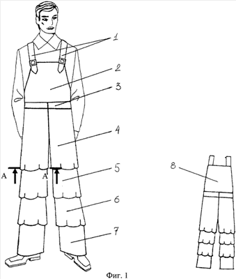 Сущность изобретения поясняется чертежами, где на фиг.1 представлено конструктивное устройство полукомбинезона (вид спереди и вид сзади), где 1 – наплечные бретели, 2 – нагрудник, 3 – пояс, 4 – первая часть половины брюк полукомбинезона, 5 – вторая часть половины брюк полукомбинезона, 6 – третья часть половины брюк полукомбинезона, 7 – четвертая часть половины брюк полукомбинезона, 8 – спинка, а на фиг.2 – узел соединения двух частей в разрезе, где 4 – первая часть половины брюк полукомбинезона, 5 – вторая часть половины брюк полукомбинезона, 9 – складки, образующие вентиляционные отверстия.