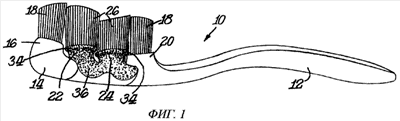 Любая пригодная форма чистящих элементов может быть использована как чистящие элементы 18 и 26 в широком применении этого изобретения. Термин “чистящие элементы” предназначен к использованию в общем значении, которое может включать стандартные волоконные щетинки, или массажные элементы, или другие формы чистящих элементов, например эластомерные штыри или стенки, размещенные в форме округлого сечения или любой желаемой формы, включая прямые или синусоидальные участки. Там, где использованы щетинки, они могут быть установлены блоками или секциями пучков, проходя через подходящие отверстия в блоках пучков так, чтобы основания щетинок были установлены внутри или ниже блока пучков.