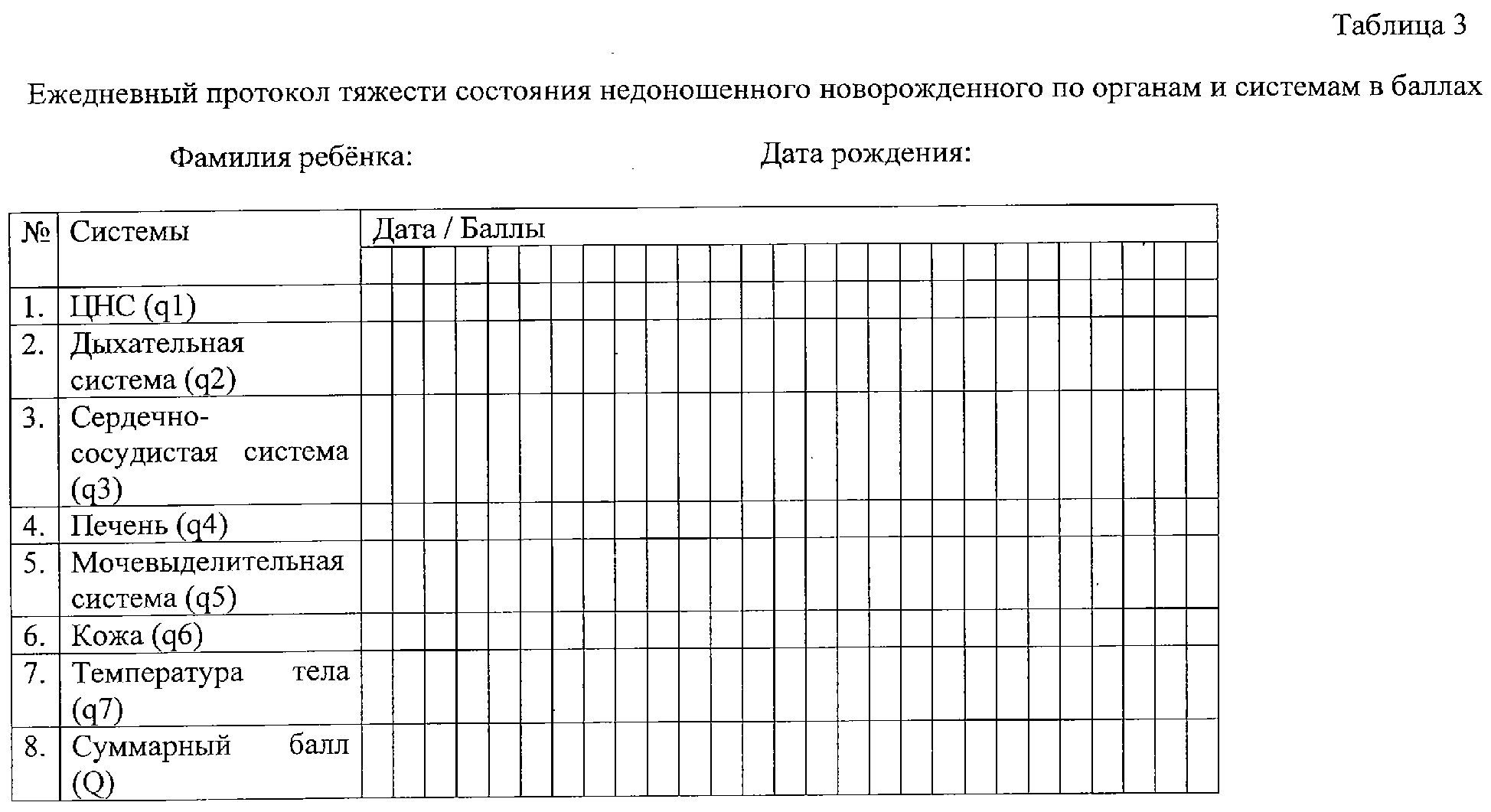Изобретение относится к медицине, а именно к перинатологии, и может быть использовано в работе палат интенсивной терапии и отделений реанимации и интенсивной терапии для недоношенных новорожденных. В ежедневной работе врач любой специальности обычно использует клиническую характеристику оценки тяжести состояния: удовлетворительное, среднетяжелое, тяжелое, очень тяжелое, крайне тяжелое. Количественная оценка тяжести состояния больного необходима не только для прогноза и риска летального исхода, но и для оптимизации интенсивной терапии. Такие шкалы, как АРАСНЕ, SAPS, MPM, SOFA, MODS, признаны многими реаниматологами и являются методом оценки взрослых больных в критическом состоянии. В неонатологии в силу анатомо-физиологических особенностей новорожденных, а тем более недоношенных, их применение ограничено из-за невозможности широкого использования инвазивных методов исследований. Наиболее известным и распространенным способом оценки состояния новорожденного ребенка является шкала Апгар для оценки тяжести асфиксии и эффективности лечебных мероприятий (Шабалов Н.П. Неонатология. Т.1. Москва. «МЕДпресс-информ». 2004). Известен и общепринят также способ оценки тяжести дыхательной недостаточности у недоношенных новорожденных – шкала Сильвермана (Шабалов Н.П. Неонатология. Т.1. Москва. «МЕДпресс-информ». 2004, с.515). Существуют также и другие способы оценки состояния новорожденных, основанные на инвазивных методах исследования (Патент РФ №2075084 «Способ оценки состояния новорожденного ребенка», G01N 33/68, публ. 10.03.1997, патент РФ №2223039 «Способ прогнозирования нарушений здоровья у детей первого года жизни, родившихся с синдромом задержки внутриутробного развития», А61В 10/00, публ. 10.02.2004, патент РФ №2232544 «Способ дифференцированной оценки степени тяжести состояния при перинатальном поражении центральной нервной системы у детей раннего возраста», А61В 5/02, публ.20.07.2004). Шкала-прототип громоздка, при оценке используются в т.ч. инвазивные и инструментальные методы исследования (исследование кислотно-щелочного состояния, нейросонография). Шкала создана для оценки состояния новорожденных с массой не менее 2500 г. В настоящее время не известны способы оценки тяжести состояния недоношенных новорожденных без использования инвазивных методов исследования. Задачей заявляемого изобретения является создание простого, быстрого и эффективного способа оценки тяжести состояния недоношенного новорожденного путем определения тяжести состояния его органов и систем, оценки выраженности нарушений их функций и динамики состояния в процессе лечения. Задача достигается тем, что производят оценку тяжести состояния недоношенных новорожденных в баллах в зависимости от результата клинических исследований основных органов и систем организма относительно существующих нормативных параметров. Нормативные параметры группируют по семи основным органам и системам организма, при этом оценку выраженности нарушений каждого органа и системы производят в баллах количеством от 0 до 2. Определяют степень тяжести состояния недоношенного новорожденного по формуле: q1+q2+q3+q4+q5+q6+q7=Q, где Q – суммарный балл, q1, q2, q3, q4, q5, q6, q7 – количество баллов по каждой из семи исследуемых систем и органов. При этом если величина Q суммарного балла принимает значения от 1 до 2 – это свидетель