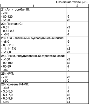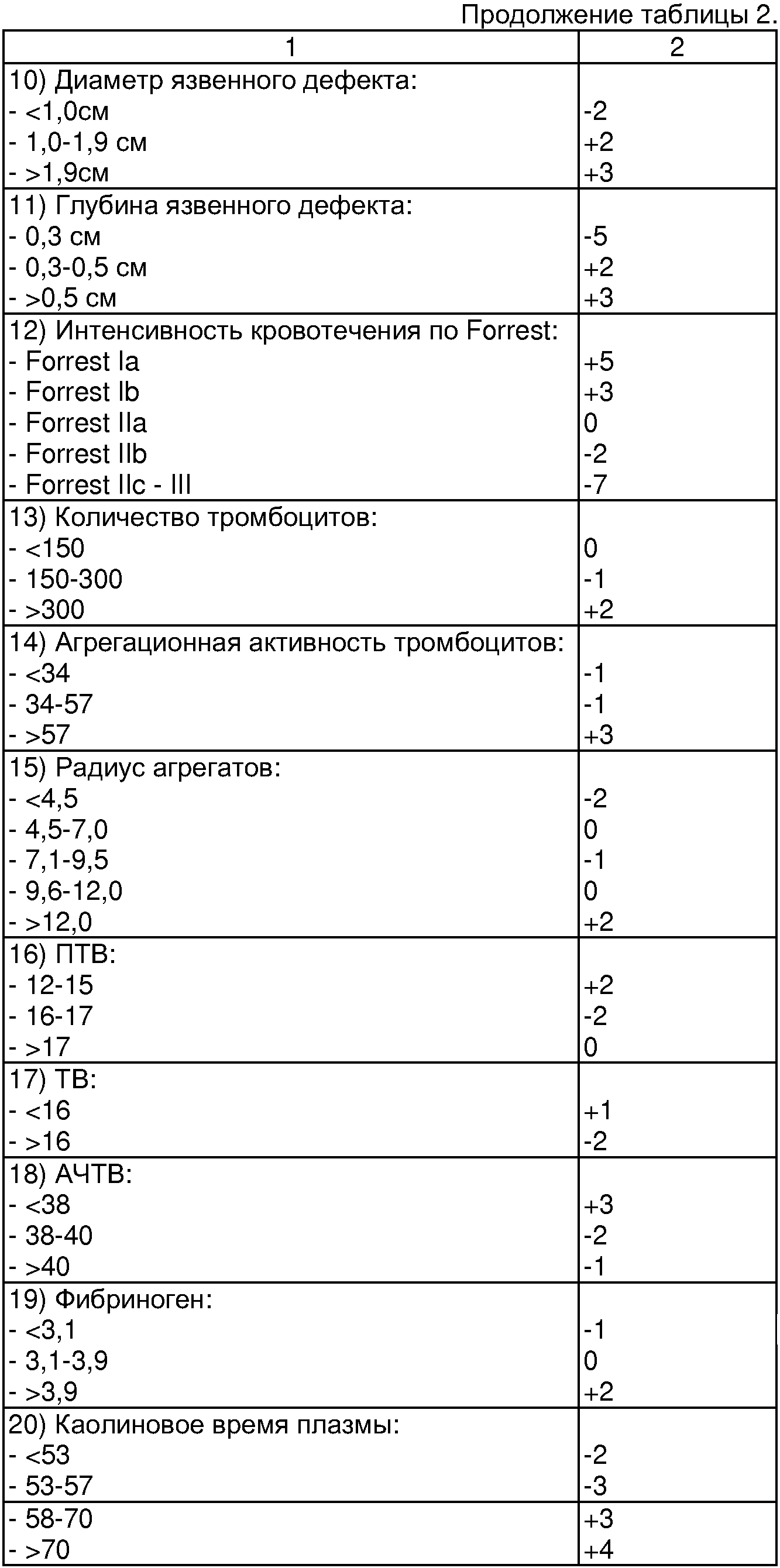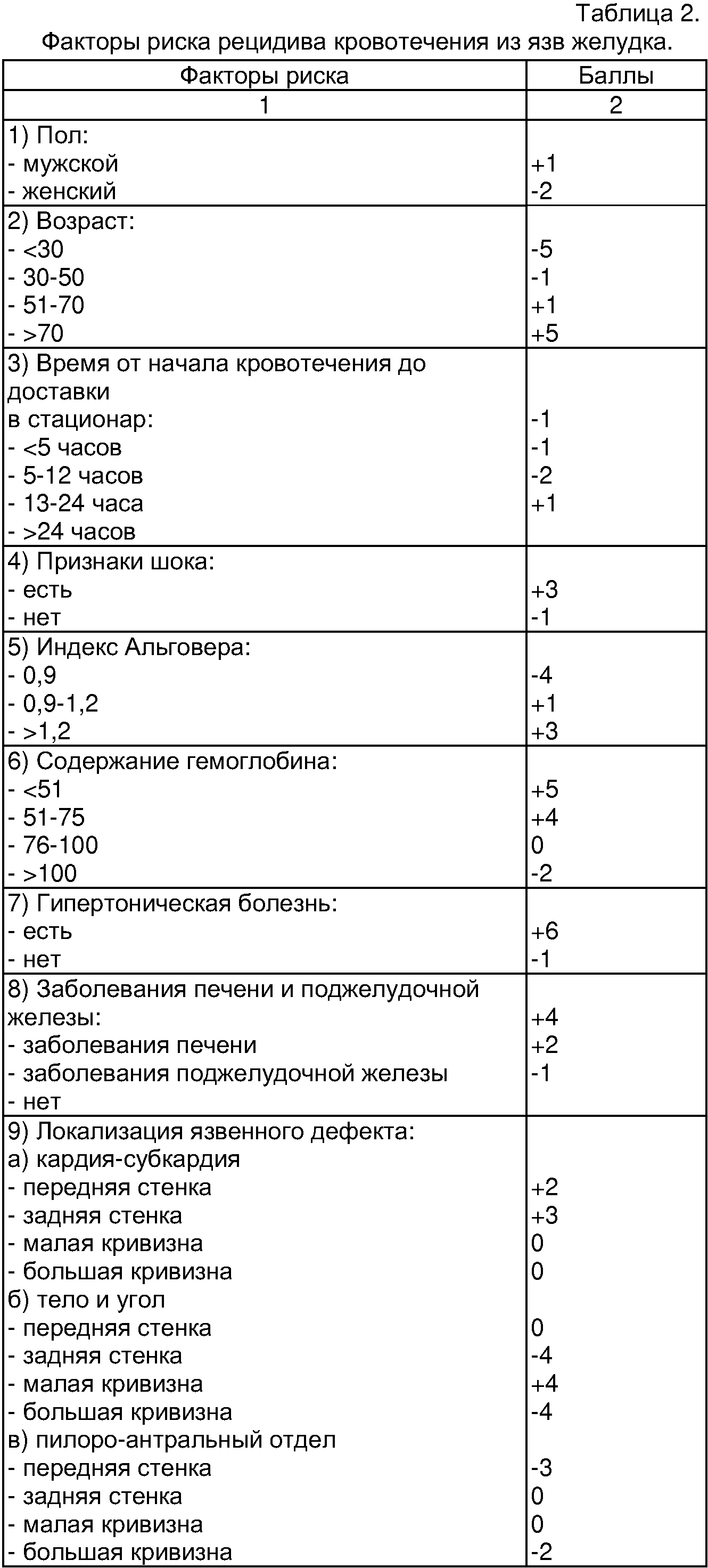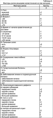 Если сумма баллов равна или больше 0, то прогнозируют наличие риска рецидива кровотечения из язвы ДПК. Если сумма баллов меньше 0, то прогнозируют отсутствие риска рецидива кровотечения из язвы ДПК. При прогнозировании риска рецидива кровотечения из язв желудка определяют факторы риска и их градации и проводят подсчет суммы баллов в соответствии с таблицей 2. Если сумма баллов равна или больше 0, то прогнозируют наличие риска рецидива кровотечения из язвы желудка. Если сумма баллов меньше 0, то прогнозируют отсутствие риска рецидива кровотечения из язвы желудка. Способ поясняется примерами, подтверждающими возможность осуществления технического решения с получением прогноза риска рецидива кровотечения при использовании всей совокупности признаков, указанных в формуле. Пример 1. Больной Т., 47 лет, поступил в клинику 01.03.05 с подозрением на желудочно-кишечное кровотечение. При выполнении ЭГДС выявлен тромбированный сосуд в дне язвы луковицы ДПК. Для определения хирургической тактики лечения у пациента были определены факторы риска рецидива кровотечения, осуществлено прогнозирование риска рецидива кровотечения по предлагаемому способу. Каждому анамнестическому, лабораторному и эндоскопическому показателю (фактору риска) были определены баллы в соответствии с таблицей 1 и подсчитана их сумма. Анамнестические и клинические показатели: пол мужской – 0 баллов, возраст 47 лет – (+)3 балла, время от начала кровотечения до поступления в клинику 36 часов – (+)3 балла, имеет признаки геморрагического шока на догоспитальном этапе – (+)3 балла, индекс Альговера 0,8 – (-)1 балл, гипертонической болезни нет – 0 баллов, заболеваний печени и поджелудочной болезни нет – (-)2 балла. Эндоскопические показатели: локализация язвенного дефекта на передней стенке – (-)2 балла, диаметр язвенного дефекта 0,6 см – (-)1 балл, глубина язвенного дефекта 0,2 см – (-)2 балла), тромбированный сосуд в дне язвы F2a – (+)2 балла. Лабораторные показатели: уровень гемоглобина 60 г/л – (+)3 балла, количество тромбоцитов 223*109/л – (-)3 балла, агрегационная активность тромбоцитов 68,1% – (+)3 балла, радиус агрегатов 7,12 мкм – (-)2 балла, ПТВ 16 сек. – (-)1 балл, ТВ 15 сек. – (+)2 балла, АЧТВ 35 сек. – (+)4 балла, уровень фибриногена 2,2 г/л – (-)4 балла, каолиновое время 59 сек. – (+)2 балла, антитромбин III 126% – (+)3 балла, протеин С 0,7 – (+)3 балла, XIIa – зависимый эуглобулиновый лизис 8мин. 10 сек. – (-)2 балла, лизис, индуцированный стрептокиназой 73 сек. – (-)4 балла, индекс резерва плазминогена 96% – (-)2 балла, РФМК 5,5*10-2 г/л – 0 баллов. Исходя из полученных данных, произведен подсчет суммы баллов: 0+3+3+3+(-1)+0+(-2)+(-2)+(-1)+(-2)+2+3+(-3)+3+(-2)+(-1)+2+4+(-4)+2+3+3+(-2)+(-4)+(-2)+0=(+)5 Сумма баллов равна (+)5. У пациента прогнозируют наличие риска рецидива кровотечения и в связи с этим рекомендуют наблюдение в палате интенсивной терапии. Через 10 часов у больного возник рецидив кровотечения и он был оперирован. Выписан с выздоровлением через 18 суток. Пример 2. Больной У., 36 лет, поступил в клинику 26.11.04. с желудочно-кишечным кровотечением. Во время проведения ЭГДС выявлен тромбированный сосуд в дне язвы луковицы ДПК. Для определения хирургической тактики было осуществлено прогнозирование риска рецидива кровотечения по предлагаемому способу. Анамнестические и клинические показатели: пол мужской – 0 баллов, возраст 36 лет – (+)3 балла, время от начала кровотечения до посту