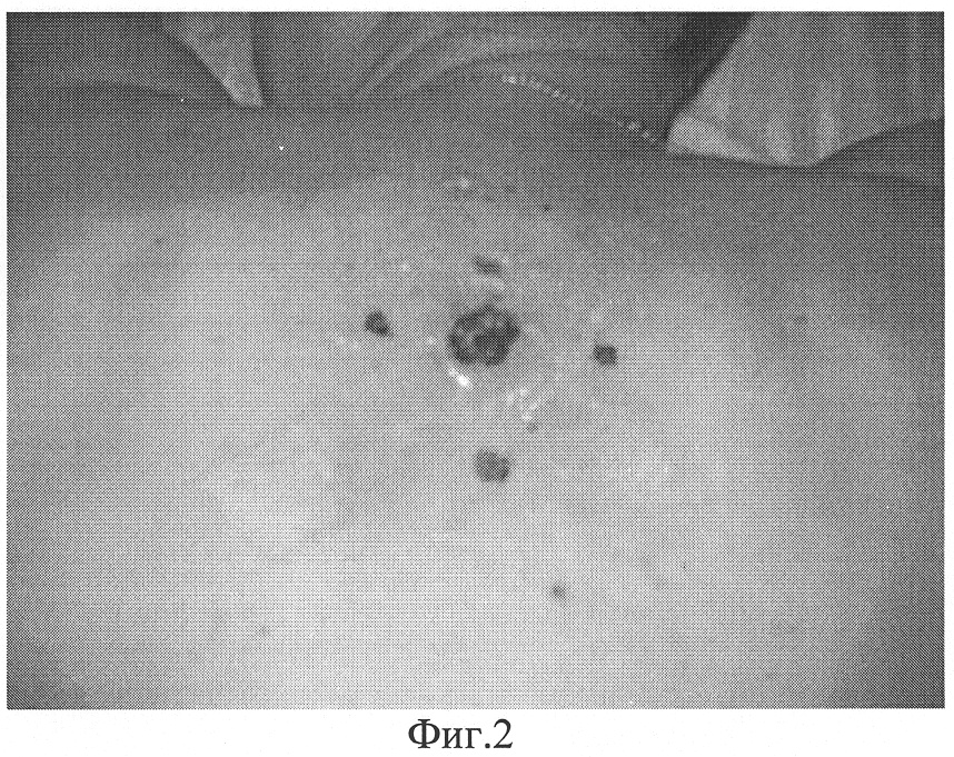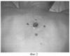 Далее была проведена трехмерная ангиография для уточнения васкуляризации образования. В результате проведенного исследования было установлено, что образование имеет сосудистую ножку в основании, которая частично распространяется в подкожную клетчатку (Фиг.1). После произвели на коже маркировку точек предполагаемых проколов для введения химиопрепаратов вне сосудистого русла (Фиг.2).