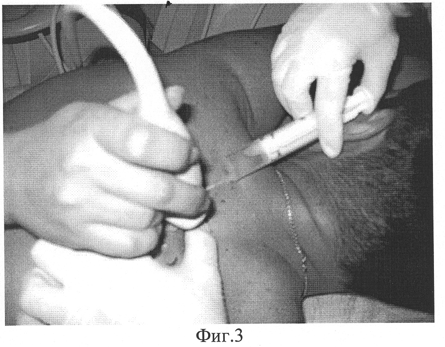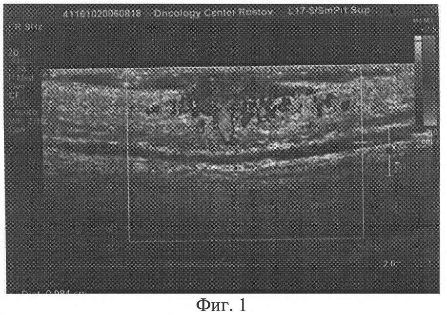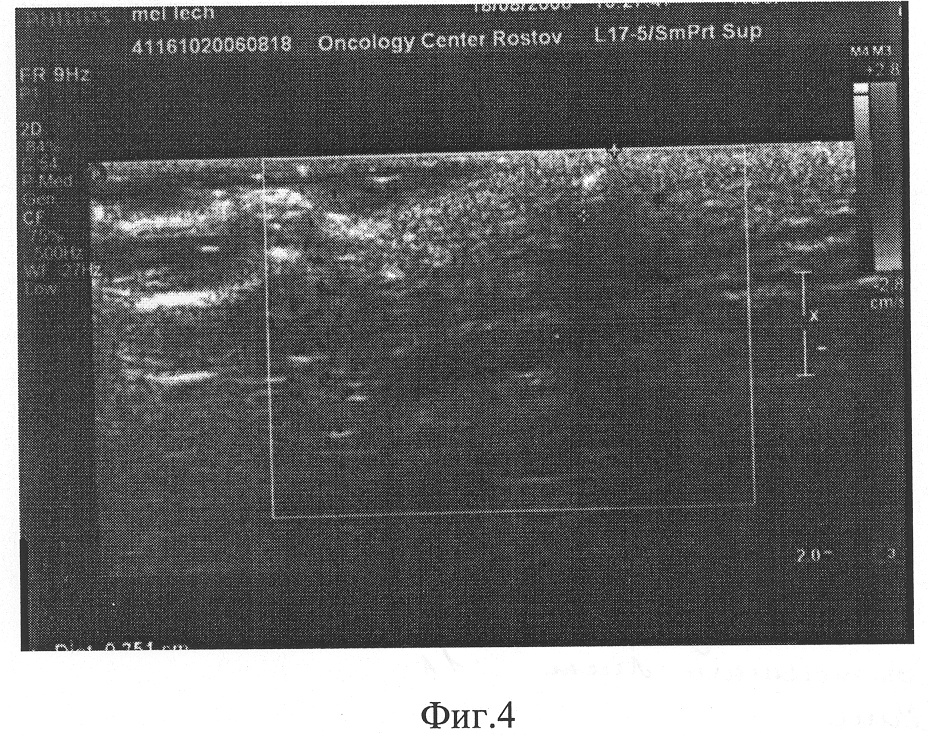 Комплексное лечение заключалось в следующем: 20.08.2004 г. провели паратуморальную аутоплазмохимиотерапию: пунктировали локтевую вену, забрали 20 мл крови, центрифугировали ее в течение 30 мин при 1500 об/мин. Затем плазму крови инкубировали с цитостатиками: цисплатин – 10 мг, метотрексат – 25 мг, циклофосфана – 600 мг в термостате в течение 30 мин, при температуре 37°С, а затем ввели пациенту в подкожную жировую клетчатку непосредственно под очаг злокачественного роста, через намеченные под контролем УЗИ точки вне сосудистого русла, отступая 1,5 см от края опухоли проколами под углом 45° (Фиг.3, 4). В этот же день начали сеансы дистанционной гамма-терапии в очаговой дозе 2,4 Гр в течение 15 дней. Суммарная очаговая доза дистанционной гамма-терапии – 36 Гр. После окончания первого этапа лечения визуально уменьшился экзофитный компонент образования, появились очаги депигментации. При повторном УЗ-исследовании отмечена положительная динамика. 5.09.2004 г. больной был переведен в отд. реконструктивно-пластической хирургии, где ему была выполнена операция – широкое иссечение меланомы кожи спины с пластикой серповидным кожным лоскутом. Послеоперационный период протекал гладко, без особенностей. Швы сняты на 13-е сутки. Гистологический анализ от 5.09.2004 г. №733322-324 – меланома из эпителиоподобных и невусоподобных клеток с умеренным содержанием меланина, очагами изъязвления, фиброза. Инвазия III-IV уровня по Кларку. Толщина опухоли по Бреслоу – 4,5 мм, выраженная лимфоцитарная инфильтрация с наличием большого количества гигантских многоядерных клеток, типа инородных тел. Больной находится под наблюдением в течение двух лет без признаков рецидива.