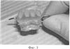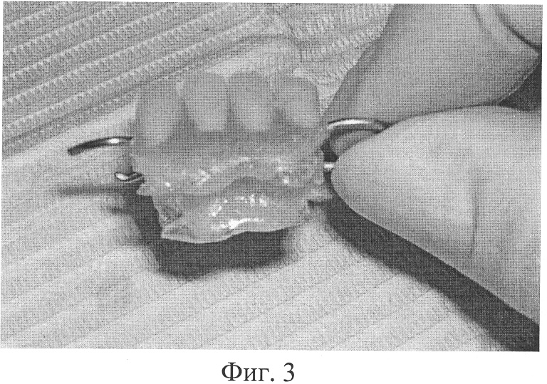 Коррекцию протеза осуществляют непосредственно в полости рта с помощью эластичной пластмассы «Coe-Soft» GC на следующие сутки после оперативного вмешательства, когда уже началось заживление операционной раны, снижение отечности и болевой чувствительности за счет стимулирующего действия аутоплазмы (фиг.2). Этот факт позволяет беспрепятственно изготовить мягкий слой непосредственно в полости рта, который будет максимально точно повторять рельеф протезного ложа, а следовательно, и равномерно распределять жевательную нагрузку. Для этого на внутреннюю поверхность базиса протеза стерильным шпателем наносят приготовленную согласно инструкции фирмы производителя эластичную пластмассу «Coe-Soft» GC. Затем протез фиксируют в полости рта в положении центральной окклюзии. После полимеризации протез извлекают, обрезают избыток материала и накладывают на постоперационный дефект (фиг.3, 4).