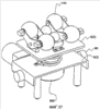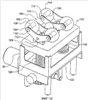 На фиг.12 показан альтернативный вариант выполнения массирующих выступов 100. Массирующие выступы 100 предпочтительно разделены на первую и вторую пары 102 и 104. Здесь выступы первой пары 102 выровнены параллельно выступам второй пары 104. Каждый из массирующих выступов 100 включает нагреватель 106, которым может быть нагревательная лампа, генерирующая тепло и инфракрасные лучи.