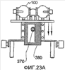 Здесь применено роликовое зубчатое колесо 370 для подъема верхней пластины 320, прикрепленное к приводному электродвигателю 374, который прикреплен к нижней пластине 356. Здесь верхняя пластина 320 имеет верхнюю часть 376 и нижнюю часть 378, и входящий в зацепление корпус 380 отступает вниз от нижней части 378 подъемника 320. Во входящем в зацепление корпусе 380 сформирован удлиненный по вертикали проем 382 корпуса для образования вертикальных стенок 384 во входящем в зацепление корпусе 380. В этой конфигурации одна из вертикальных стенок 384 конфигурирована как вертикальная зубчатая рейка 386 таким образом, что роликовое зубчатое колесо 370 с возможностью качения входит в зацепление с вертикальной зубчатой рейкой 386, в результате чего вращение роликового зубчатого колеса электродвигателем 374 обеспечивает совершение подъемником 320 вертикального возвратно-поступательного движения сквозь проем 322, при этом входящий в зацепление корпус 380 с возможностью движения поддерживается внутренней периферийной поверхностью 324 подъемника 320.