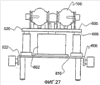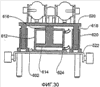 Как показано на фиг.30, гидравлический привод 602 имеет полый цилиндр 612, поршень 614, совершающий возвратно-поступательное движение в цилиндре 612, и шток 616, прикрепленный к поршню 614 и к верхней пластине 520. Четыре направляющих 618 подъемника отступают вниз от нижней поверхности 606 верхней пластины 520 в четырех углах верхней пластины 520. Четыре направляющих гильзы 620 подъемника отступают вверх от верхней поверхности 608 нижней пластины 522 и с возможностью освобождения принимают направляющие 618 подъемника.