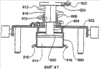 Как показано на фиг. 41, гидравлический цилиндр 900 имеет камеру 914, в которую от компрессора 902 поступает жидкость под давлением по впускной трубке 916, и жидкость выпускается по выпускной трубке 918. Поршень 920 совершает возвратно-поступательное движение в камере 914 за счет изменения давления, прилагаемого жидкостью под давлением. Шток 904 цилиндра прикреплен к поршню 920. Пружина 912 растяжения прикреплена к верхней пластине 820 и к нижней пластине 822 винтами 922 и кронштейнами 924, которые прижимают концы пружины 912 растяжения к верхней пластине 820 или к нижней пластине 822. Направляющий ствол 906 прикреплен к верхнему концу штока 904 цилиндра. Направляющий ствол 906 соединен с верхней пластиной 820 фланцем 926.