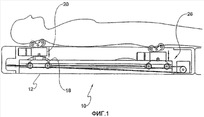 фиг.1 – вид горизонтального массажера, соответствующего настоящему изобретению, с лежащим на нем пациентом;
