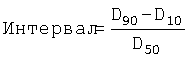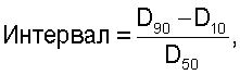 в которой D10 – диаметр, соответствующий диаметру частиц, которые составляют 10% общего объема, содержащего частицы равного или меньшего диаметра, D50 – диаметр, соответствующий диаметру частиц, которые составляют 50% общего объема, содержащего частицы равного или меньшего диаметра, и D90 – диаметр, соответствующий диаметру частиц, которые составляют 90% общего объема, содержащего частицы равного или меньшего диаметра.