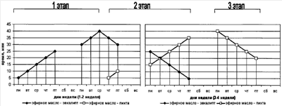 В качестве примера схемы проведения процедур была выбрана схема, предусматривающая процедуру продолжительностью от 20 минут до 3 часов (Миргородская С.А. Аромалогия: QUANTUM SATIS, – 1-е изд., – М.: «НАВЕУС», 1999. – С.49). Недостатком данной схемы проведения процедуры ингаляции является то, что она не регламентирует время использования эфирных масел в комбинации одного с другим при поэтапном внедрении, что является необходимым в качестве оценки переносимости используемого эфирного масла эвкалипта и впоследствии пихты.