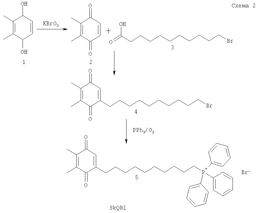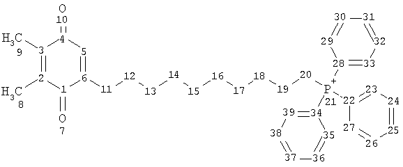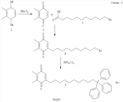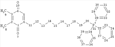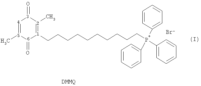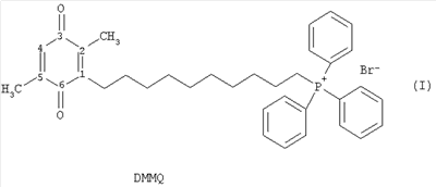 Митохондриально адресованный антиоксидант MitoQ и его варианты (MitoQ5, MitoQ3) представляют собой убихинон (убихинол в восстановленной форме), соединенный с трифенилфосфонием через С-10 линкерную группу (С-5, С-3 соответственно). В описании изобретения US 6331532 MitoQ заявлен как действующее вещество композиций, предназначенных для лечения и профилактики заболеваний, связанных с окислительным стрессом. В экспериментах, приведенных в описании изобретения, показаны антиоксидантные свойства MitoQ в растворе, способность этого вещества проникать в изолированные митохондрии, влияние на эффективность дыхания изолированных митохондрии. Однако не приводится никаких данных о действии MitoQ на отдельные клетки, ткани, органы, о наличии или отсутствии токсичности.