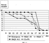 SkQ1 давался мышам линии NMRI вместе с питьем в различных концентрациях – 10, 1, или 0,1 мкМ. Результаты (выживаемость мышей с предварительно привитой асцитной карциномой) приведены на фиг.13. Отрицательным контролем в эксперименте служила вода, положительным – известный антираковый препарат цисплатин.