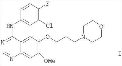 Средство описано в международной заявке на патент WO 96/33980 (пример 1) и является эффективным ингибитором семейства ферментов тирозинкиназ рецептора эпидермального фактора роста (EGFR), таких как erbBl. Средство имеет структуру формулы I