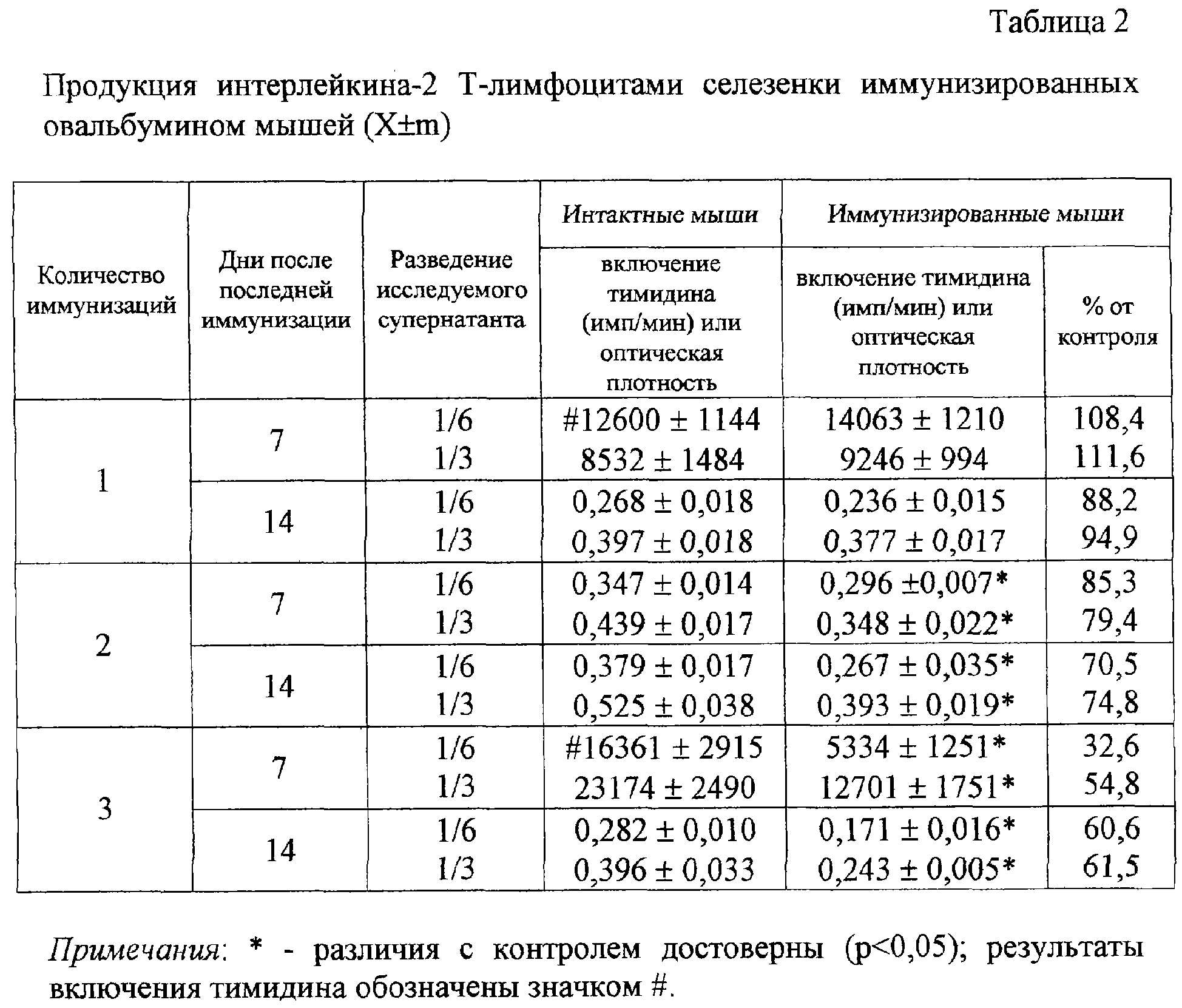 -счетчике. Пролиферацию клеток выражали в количестве импульсов в минуту. При оценке пролиферации колориметрическим методом клетки культивировали 4 суток в круглодонных 96-луночных планшетах (2-5×104 клеток/лунку) в указанных выше условиях. За 4 ч до окончания культивирования в лунки вносили 3-[4,5-dimethylthiazol-2-yl]-2,5-diphenyltetrazolium bromide (MTT, «Serva»), концентрация которого в лунках составляла 200 мкг/мл. Затем из лунок удаляли надосадок, а осадок растворяли диметилсульфоксидом (димексид, «Татхимфармпрепараты»). Абсорбцию полученных растворов замеряли при помощи многоканального спектрофотометра («Titertek») при длине волны 550 нм. Определение количества интрелейкина-4 в исследуемых супернатантах осуществляли твердофазным иммуноферментным методом при помощи тест-системы («Amersham Biosciences») согласно прилагаемым к ней протоколам.