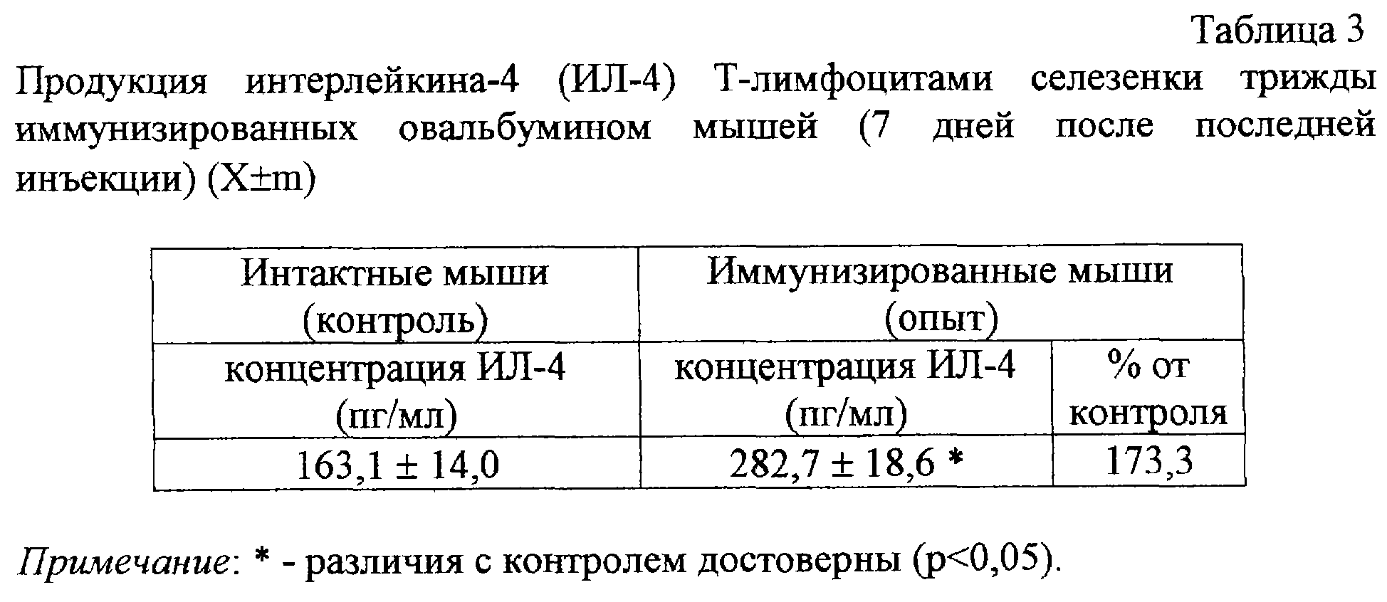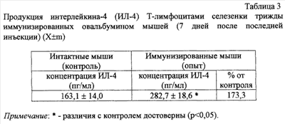 где О и К – масса соответственно опытной и контрольной лап. Разрешающая доза антигена (20 мкг овальбумина) не вызывала отека при введении в лапу неиммунизированным мышам. Как видно из таблицы 4, полученные предлагаемым способом поляризованные лимфоциты обладали тем же свойством, что и лимфоциты, полученные в наиболее близком к заявляемому способу (прототипу) – обладали способностью индуцировать Th2-зависимый отек. Использование предлагаемого изобретения позволяет получить достаточное количество поляризованных лимфоцитов Th2 типа для моделирования иммунного ответа Th2 типа без дорогостоящих реактивов (цитокинов и антител к ним) и животных (трансгенных мышей) и упростить способ за счет исключения стадии культивирования клеток.