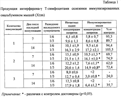 Изобретение относится к медицине и может быть использовано в фармакологии для создания модели для изучения действия веществ на иммунный ответ Th2 типа. Известен способ (прототип) получения поляризованных лимфоцитов для индукции кожной воспалительной реакции [1], заключающийся в получении поляризованных лимфоцитов Th2 типа in vitro, для чего выделяют спленоциты из селезенок трансгенных (анти-овальбумин ТКР) мышей линии BAlb/с, культивируют 3 суток в присутствии смеси антигена (овальбумина), интерлейкина-4 и антител к интерлейкину-12, после чего подготовленные таким образом клетки вводят интактным сингенным мышам и получают отек. Недостатком данного способа является то, что он сложен в исполнении и для его осуществления требуются дорогостоящие реактивы (цитокины и антитела к ним) и животные (трансгенные мыши). Целью предлагаемого изобретения является упрощение способа получения поляризованных лимфоцитов Th2 типа и снижение финансовых затрат. Поставленная цель достигается тем, что поляризацию лимфоцитов осуществляют in vivo: проводят гипериммунизацию конвенциональных мышей линии BAlb/c путем трехкратного введения под кожу бедра овальбумина по 100 мкг/мышь с адъювантом гидроокисью алюминия по 5 мг/мышь с интервалом в 14 дней. Через 7 дней после последней инъекции осуществляют забор селезенок, которые содержат достаточное количество поляризованных лимфоцитов Th2 типа, что устанавливают по изменению профиля продуцируемых ими цитокинов-интерлейкина-4, интерлейкина-2 и интерферона- Новым в предлагаемом способе является гипериммунизация овальбумином с гидроокисью алюминия путем их трехкратного введения под кожу бедра с интервалом в 14 дней между инъекциями. Известно, что в основе многих заболеваний лежит нарушение функционирования иммунной системы. Для корректной фармакотерапии этих заболеваний необходимо учитывать их иммунопатогенез, т.е. какой тип иммунного ответа (Тh1 или Th2) развивается в том или ином случае. Поскольку меры, направленные на подавление одного типа иммунного ответа, повлекут за собой стимулирование другого типа иммунного ответа, то знание типа иммунного ответа необходимо для определения стратегии лечения. Известно, что под действием антигена наивные Т-лимфоциты необратимо дифференцируются в два разных типа – Th1 или Th2, которые различаются по набору секретируемых цитокинов. Для Th2 характерны следующие черты: секреция интерлейкина-4, интерлейкина-5, интерлейкина-10, участие в защите от гельминтов, стимулирование генерации В-лимфоцитов, синтезирующих иммуноглобулины класса Е [2; 3]. Основным фенотипическим признаком Th1 является высокая продукция интерферона- Баланс между дифференцировкой Т-хелперов в Th1 или Th2 является определяющим для исхода иммунного ответа [5]. Поляризация по второму типу обеспечивает реакции гиперчувствительности немедленного типа (анафилактические реакции, бронхиальная астма, гельминтозы), характерными признаками которых являются эозинофилия и повышенный синтез иммуноглобулина класса Е [7; 8], либо состояния толерантности (оральная толерантность, беременность, опухолевый рост), для которых характерна гиперпродукция Т-лимфоцитами трансформирующего фактора роста бета и интерлейкин-10 [9; 10]. Особую социально-медицинскую значимость исследованиям, посвященным регуляции функциональной активности пол