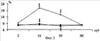 Из фиг.3 видно, что у животных, получавших вепезид, с 16-30 сут опыта отмечалось достоверное увеличение (более чем в 2 раза по сравнению с контролем) процента патологических форм сперматозоидов. При сочетанном введении препаратов процент патологических форм в эти дни опыта был достоверно снижен, чем при введении одного вепезида, и оказался практически на уровне контрольных значений.