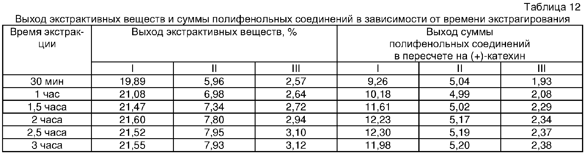 Также определено оптимальное соотношение фаз сырье-экстрагент, соответствующее 1:(10-15). Увеличение объема экстрагента неоправданно ввиду незначительного увеличения выхода экстрактивных веществ и полифенольных соединений (таблица 11).