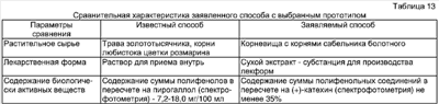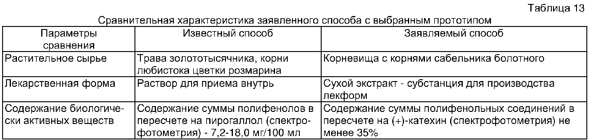 Таким образом, предлагаемый способ получения по сравнению с известным (таблица 13) позволяет получить препарат постоянного состава с более высокой диуретической и противовоспалительной активностью за счет использования рациональной технологии получения и содержанием полифенольных соединений в пересчете на (+)-катехин не менее 35%.