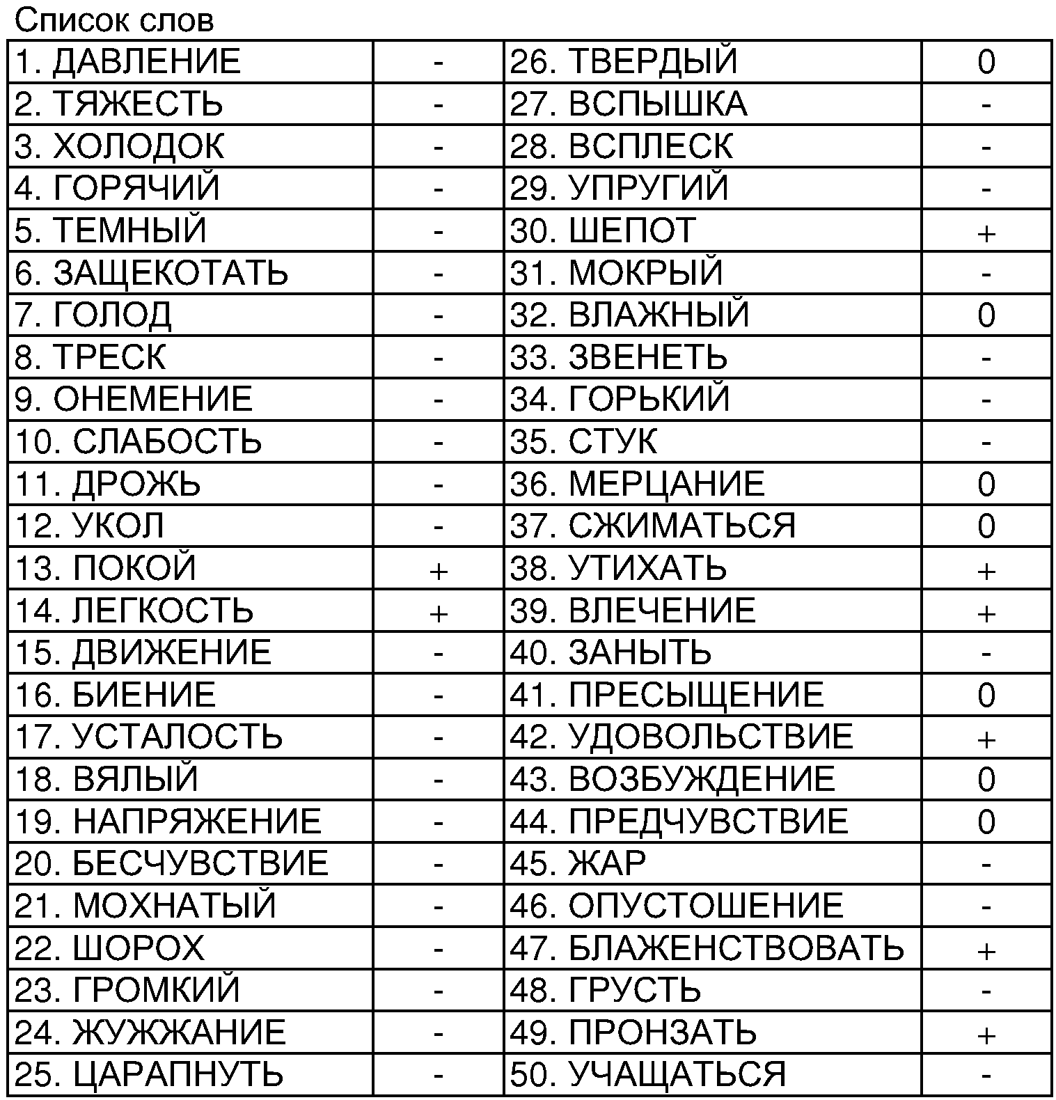 Изобретение относится к медицинской и клинико-психологической диагностике и может использоваться для своевременной оценки нарушений системы эмоционально-когнитивной оценки телесных ощущений у больных с неврологической и соматической патологией, страдающих хроническими болевыми синдромами и расстройствами чувствительности. Субъективные ощущения, возникающие при внешних или внутренних воздействиях на организм человека, неразрывно связаны с их эмоциональной и когнитивной оценкой. Хотя психологической оценке подвергаются информационные воздействия самого разного характера, для медицинской практики особое значение имеют особенности эмоционального и когнитивного восприятия телесных ощущений, возникающих под действием факторов внешней и внутренней среды организма на органы чувств. Оценка взаимодействий человека с внешним миром или самим собой и порождаемых такими взаимодействиями ощущений может быть как осознанной, выражаемой в словах, так и неосознанной, выражаемой в эмоциях и чувствах (Творогова Н.Д., 2002; Liddle P.F., 2001). Важность диагностики расстройств в системе эмоционально-когнитивных оценок телесных ощущений в медицинской практике определяется тем, что особенности оценочной деятельности влияют во многом на характер поведенческого реагирования человека (Dewe P., 1991; O’Driscoll M.P.; Cooper С.L. 1994; Deary I.J.; Blenkin H., 1996; Van Egeren L.F., 2000), которое, в свою очередь, сказывается на успешности преодоления болезни. Наряду с этим, дисбаланс в системе эмоционально-когнитивных оценок телесных ощущений с преобладанием реакций отрицательного знака, по-видимому, может быть индикатором психологического и физиологического неблагополучия, перенапряжения и истощения адаптационных физиологических и психологических ресурсов человека. Наиболее распространенным способом диагностики состояния системы эмоционально-когнитивной оценки телесных ощущений является опрос больного и выяснение его жалоб в процессе клинического обследования. Однако сбор жалоб больного осуществляется в произвольной форме и направлен лишь на выявление дискомфортных, негативно воспринимаемых телесных ощущений, нарушающих благополучие человека. К известным способам диагностики состояния эмоционально-когнитивной оценки телесных ощущений может быть отнесена визуальная шкала оценки телесных ощущений, широко используемая для самооценки больным интенсивности головной боли, головокружения и других дискомфортных соматических ощущений. Выраженность ощущения отражается в виде точки на отрезке горизонтальной линии длиной 10 см, левый конец которого обозначает отсутствие ощущения, а правый конец – его максимальную выраженность (Downie W.W. и соавт., 1978). Визуальная аналоговая шкала широко используется в клинической практике для оценки выраженности боли и головокружения. (Masur H. и соавт., 2004). К недостаткам визуальной аналоговой шкалы относится то, что она позволяет измерять интенсивность переживания лишь отдельных телесных ощущений, не давая представления о системе их эмоционально-когнитивной оценки в целом. Для диагностики состояния системы психической оценки телесных ощущений также может быть использована техника семантического дифференциала Осгуда, согласно которому испытуемому предлагается указать на точку расположения оцениваемого им и выражаемого соответст
