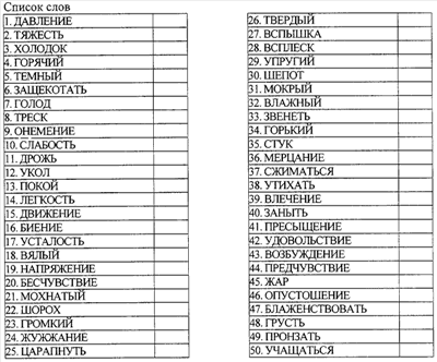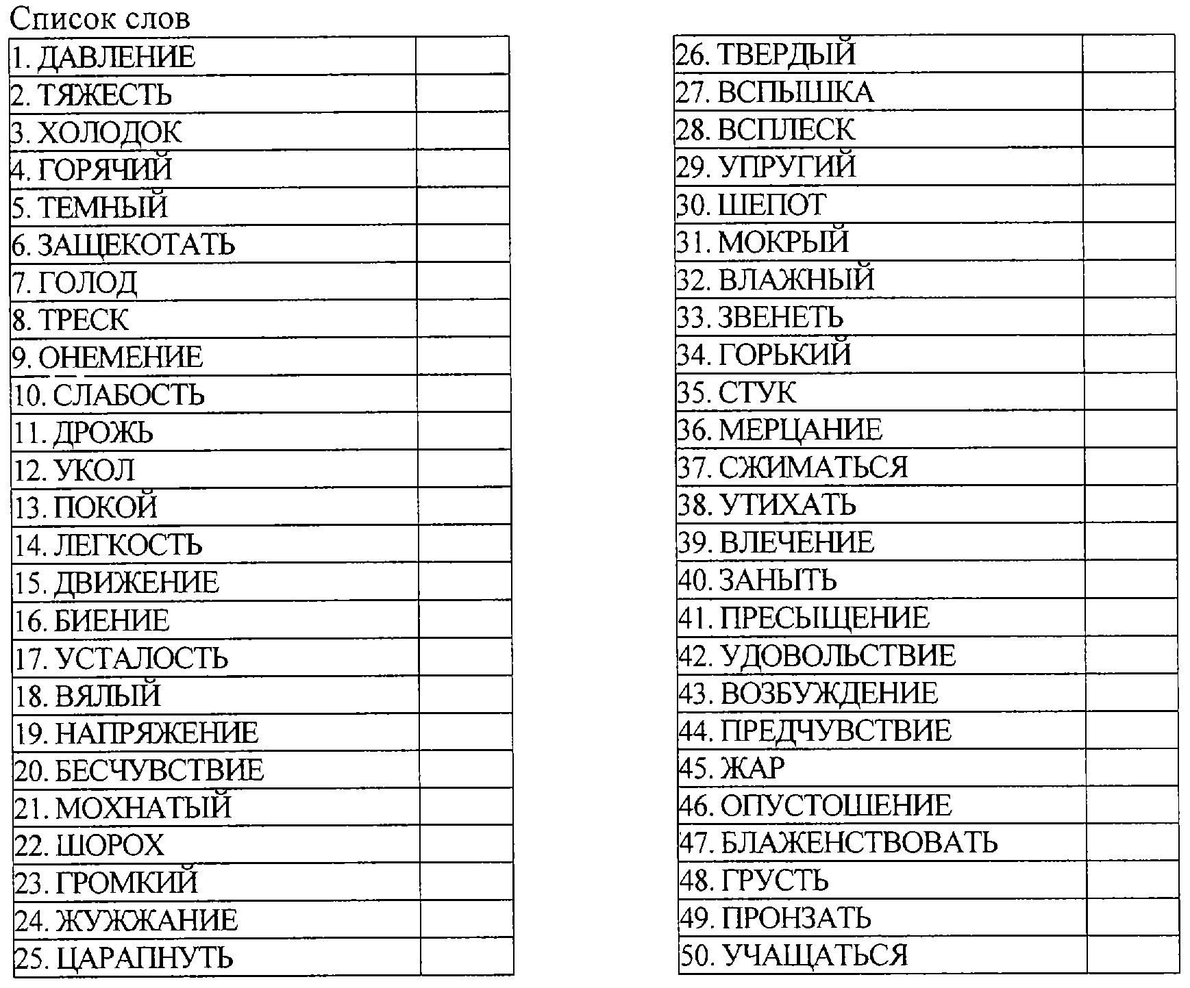 1. Способ диагностики нарушений системы эмоционально-когнитивной оценки телесных ощущений при хронических болевых синдромах и заболеваниях, сопровождающихся расстройством чувствительности, включающий предъявление испытуемому списка слов, описывающих телесные ощущения, просьбу оценить каждое из этих слов в соответствии с заданными критериями, анализ данных испытуемым оценок слов с подсчетом процентного содержания слов, соответствующих заданным критериям, отличающийся тем, что испытуемому предъявляют список из 50 слов, обозначающих телесные ощущения, в котором 5 слов имеют традиционно позитивное эмоционально-когнитивное значение, 5 слов – традиционно негативное эмоционально-когнитивное значение, а остальные 40 слов – нейтральное эмоционально-когнитивное значение; просят испытуемого указать для каждого слова вызываемый этим словом эмоциональный отклик, выбрав один из следующих ответов: вызывает положительный эмоциональный отклик; вызывает отрицательный эмоциональный отклик; не вызывает никакого эмоционального отклика или вызывает эмоциональный отклик неопределенного знака; затем определяют процентное содержание слов, вызывавших у испытуемого положительный эмоциональный отклик, и при величине его 12% и ниже диагностируют патологическое уменьшение позитивной составляющей эмоционально-когнитивной оценки телесных ощущений; аналогично подсчитывают процентное содержание слов, вызвавших отрицательный эмоциональный отклик, и при величине его 70% и выше диагностируют патологическое повышение негативной составляющей эмоционально-когнитивной оценки телесных ощущений. 2. Способ по п.1, отличающийся тем, что используют следующий список из 50 слов: давление, тяжесть, холодок, горячий, темный, защекотать, голод, треск, онемение, слабость, дрожь, укол, покой, легкость, движение, биение, усталость, вялый, напряжение, бесчувствие, мохнатый, шорох, громкий, жужжание, царапнуть, твердый, вспышка, всплеск, упругий, шепот, мокрый, влажный, звенеть, горький, стук, мерцание, сжиматься, утихать, влечение, заныть, пресыщение, удовольствие, возбуждение, предчувствие, жар, опустошение, блаженствовать, грусть, пронзать, учащаться. 3. Способ по п.1, отличающийся тем, что к словам, имеющим традиционно позитивное значение, относят следующие 5 слов: покой, легкость, движение, удовольствие, блаженствовать. 4. Способ по п.1, отличающийся тем, что к словам, имеющим традиционно негативное значение, относят следующие 5 слов: тяжесть, слабость, вялый, заныть, опустошение.