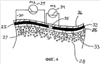 На фиг.4 подробно проиллюстрировано функционирование двух частей 25, 32 из гибкого электропроводящего материала, включая эффекты, создаваемые изолирующим промежуточным участком 35. Показано поперечное сечение частей 25, 32 из гибкого электропроводящего материала, находящихся в непосредственном контакте с поверхностью 26 кожи пациента 16. Поддерживающая часть 36 прикреплена к частям 25, 32 из гибкого электропроводящего материала, чтобы способствовать удерживанию частей 25, 32 из гибкого электропроводящего материала в контакте с поверхностью 26 кожи. Пути 27 тока создаются по поверхности частей 25, 32 из гибкого электропроводящего материала и через жировое отложение 28 в том месте, где части 25, 32 из гибкого электропроводящего материала покрывают поверхность 26 кожи. Первый милливольтметр 29 подсоединен параллельно первому участку 30 между двумя точками, которые обе находятся на поверхности части 25 из гибкого электропроводящего материала. Этот первый милливольтметр показывает очень малое напряжение на участке 30, поскольку концевые точки первого участка 30 находятся на одной и той же части 25 из гибкого электропроводящего материала. Второй милливольтметр 34 подсоединен параллельно второму участку 31 между точкой на поверхности части 25 из гибкого электропроводящего материала и второй точкой на поверхности части 32 из гибкого электропроводящего материала, при этом участок 31 проходит через изолирующий промежуточный участок 35. Второй милливольтметр 34 показывает напряжение между частями 25, 32 из гибкого электропроводящего материала. Изолирующий промежуточный участок 35 позволяет каждой из частей 25, 32 из гибкого электропроводящего материала сохранять потенциал независимо друг от друга и от каких-либо других частей из гибкого электропроводящего материала, находящихся в контакте с кожей пациента 16. Это обеспечивает протекание тока шунтирования через жировое отложение 28, находящееся вблизи каждой части 25, 32 из гибкого электропроводящего материала, но предотвращает нарушение непрерывности общего градиента потенциала, существующего в теле пациента 16.