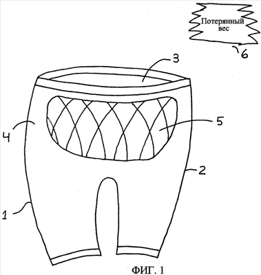 На фиг.1 показан предмет 1 одежды в соответствии с вариантом осуществления изобретения. Предмет 1 одежды предназначен для ношения его пациентом, стремящимся снизить вес. В варианте осуществления по фиг.1 предмет 1 одежды представляет собой пару длинных панталон. В других вариантах осуществления предмет 1 одежды может иметь вид любого другого предмета одежды, пригодного для того, чтобы способствовать снижению веса в соответствии с принципами, раскрытыми ниже, такого как рубашка, майка, нарукавник, наколенник, корсет, леггинсы или другие аналогичные предметы.