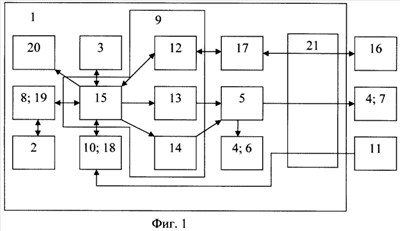 Изобретение поясняется чертежами, где на фиг.1 показана блок-схема устройства электромагнитной терапии, а на фиг.2 – функциональная связь между блоками устройства.