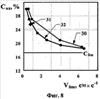На фиг.7 приведены данные о значениях Vlim при разных Сох для органического стекла, полученные с помощью устройства-прототипа (кривая 26), на ЭУ «Скорость» при проведении экспериментов на станции «Мир» (точки 27 и 28) и с помощью заявляемого устройства (кривая 29). На фиг.8 приведены данные для полиэтилена, полученные с помощью устройства-прототипа (кривая 30), на ЭУ «Скорость» на станции «Мир» (точка 31) и с помощью заявляемого устройства (кривая 32). Видно, что значения Vlim материалов, определенные на ЭУ со скорректированной высотой камеры сгорания hk, близки к значениям Vlim, определенным на ЭУ «Скорость» при проведении экспериментов на орбитальной станции «Мир».