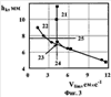 При разработке устройства-прототипа с помощью шлирен-метода (теневой фотосъемки) определялось состояние пограничного слоя при высоте камеры сгорания hk, которая соответствует значению, определенному по формуле (1). Для пояснения условий, при которых определялось состояние пограничного слоя на фиг.3, показаны графики 21 и 22, соответствующие графикам 1 и 2, приведенным на фиг.2 в описании устройства-прототипа. Состояние пограничного слоя на устройстве-прототипе определялось при высоте камеры сгорания, соответствующей параметрам точки 23 пересечения продолжения 24 вниз вертикального участка графика 21 с графиком 22. Точка 23 соответствует условиям, при которых естественная конвекция не искажает пограничный слой, но тепловые потери из зоны горения в горизонтальные стенки камеры сгорания максимальны при параметрах, соответствующих вертикальному участку графика 21.
