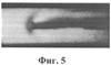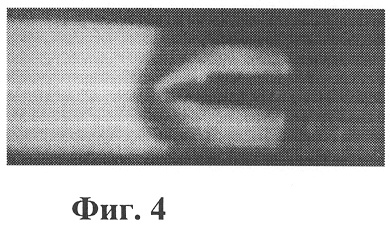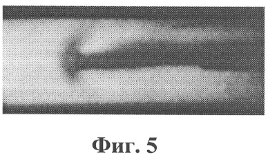 Для уточнения рабочей высоты камеры сгорания были приведены специальные исследования с использованием шлирен-метода. Была поставлена задача определить максимальные значения hk, при которых в области значений скоростей набегающего на образец газового потока, соответствующих величинам Vlim, определенным на станции «Мир», перед горящим образцом в плоской камере сгорания наблюдается симметричный относительно оси образца тепловой пограничный слой, не искаженный действием естественной конвекции. На фиг.4 и 5 представлены теневые фотографии симметричных тепловых пограничных слоев в зоне пламени газофазного горения образца органического стекла и перед зоной тления образца хлопчатобумажного шнура ШХБ-4-3,5, у которого реакция горения протекает на поверхности материала. На фиг.6 показана обычная черно-белая фотография пламени при перемещении горящего образца органического стекла в камере сгорания в подобранном методом теневой фотографии режиме подавления искажающего действия естественной конвекции. Видно, что пламя, безусловно, симметрично относительно осей образца и камеры сгорания. На фиг.2 пламя движущегося образца показано позицией 20.