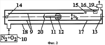 Заявляемое устройство (фиг.2) содержит камеру сгорания, рабочая часть которой образована параллельными пластинами 9 из термостойкого негорючего материала и боковыми стенками из прозрачного материала для наблюдения за горением и съемки. Для создания в камере сгорания среды с заданной концентрацией в ней кислорода устройство снабжено смесителем газов 10. Образец материала 11 закреплен на каретке 12, которая с помощью тросика электромеханического привода 13 и шкива 14 перемещается в камере сгорания с заданной равномерной скоростью. В приводе 13 используется синхронный электродвигатель и редуктор для изменения скорости вращения шкива, ведущего тросик, а следовательно, скорости перемещения образца. Электромеханический привод за счет его индивидуальной тарировки обеспечивает заданную скорость перемещения образца в камере сгорания с погрешностью не более 1%. Для зажигания образца 11 на входе в камеру сгорания имеется источник в виде электрической спирали 15. Для подведения спирали к образцу материала используется электромагнитный привод 16. Каретка 12 с образцом материала 11 при его зажигании размещается на площадке 17 камеры сгорания. Камера сгорания размещена в герметично закрывающемся сосуде 18. Для создания в сосуде давления ниже атмосферного применяется вакуум-насос 19. Сосуд 18 устанавливают таким образом, чтобы пластины 9 камеры сгорания располагались строго горизонтально. Исходя из опыта работы с устройством при испытании различных материалов, длина пластин 9 должна составлять около 1500 мм, а ширина не менее 150 мм.