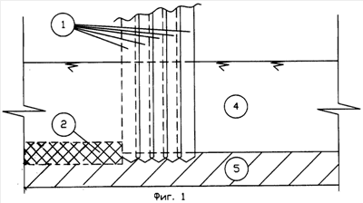 Предлагаемый способ поясняется чертежами. На фиг.1 показана вертикальная завеса, замкнутая по контуру участка, общий вид, на фиг.2 – замкнутая нижняя горизонтальная завеса, вид сверху, на фиг.3 – заполненная негорючим материалом полученная замкнутая завеса. Позициями на чертежах обозначены: