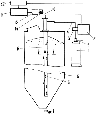 Система работает следующим образом. В процессе заполнения и эксплуатации бункера 5 внутренняя полость выходного патрубка 6 и перфорации 7 находятся в свободном состоянии без заполнения сыпучим продуктом, т.к. экранируются коническими обтекателями 8, направленными вершиной против направления движения сыпучего продукта, например угольной крошки. Из выходного патрубка 6 по дополнительному трубопроводу 10, насосом 13 через предохранительный клапан 14, осуществляется непрерывная прокачка газов на гигрометр 11. Предохранительный клапан 14 отрегулирован на пропуск заданного расхода газа при заданном давлении в дополнительном трубопроводе 10.