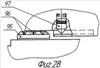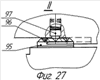 на фиг.27-28 – устройство для блокировки, в котором выступ в основании одного конька имеет два или более отверстий под фиксатор, расположенных в направлении движения; на фиг.27 – место II (фиг.19); на фиг.28 – место II перед блокировкой в момент, когда левый конек смещен вперед относительно правого конька;