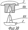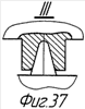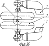 на фиг.35 – передние части роликовых коньков, снабженных механизмом привода синхронного поворота передних роликов обоих коньков посредством выступа на торцовой части оси переднего ролика левого конька и углубления в торцовой части переднего ролика правого конька, в момент взаимной фиксации выступа и углубления, при отсутствии взаимного смещения коньков; на фиг.36 – то же при смещении одного конька относительно другого в направлении движения на величину «X»; на фиг.37 – место III (фиг.35), увеличено»; на фиг.38 – то же в момент перед взаимной фиксацией выступа и углубления;