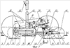 Кинематическая связь опоры для ноги 11 с задним роликом 9 включает сдвоенную кулису 27 (фиг.3, 8, 9), в одном пазу 28 которой размещен ролик 29, связанный с опорой для ноги 11, в другом пазу 30 – ролик 31, связанный с коромыслом 32, соединенным посредством вала 33 со шпонками 34 и 35 с зубчатым сектором 36, образующим зубчатую передачу с шестерней 13 на ведущем звене обгонной муфты 12.