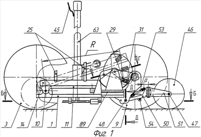 Этот неуравновешенный момент возникает вследствие того, что точка K1 приложения силы сопротивления движению «F» к переднему ролику 3 смещена относительно оси поворота ролика на величину «L1» (фиг.2, 5).
