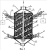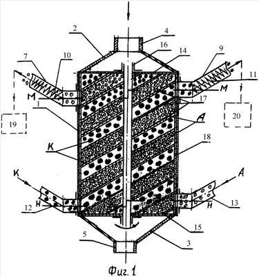 Здесь: 1 – полая цилиндрическая колонна; 2 – верхнее днище; 3 – нижнее днище; 4 – штуцер для подвода обрабатываемой жидкости; 5 – штуцер для отвода обработанной (очищенной) жидкости; 6 – выпускное окно для отвода отработанного ионита (анионита); 7 – магистраль для отвода отработанного ионита (анионита); 8 – выпускное окно для отвода отработанного ионита (катионита); 9 – магистраль для отвода отработанного ионита (катионита); 10, 11 – шнековые транспортеры; 12, 13 – магистрали для подвода свежего ионита (катионита и анионита соответственно); 14, 15 – перфорированные непровальные перегородки; 16 – ротор; 17 – двухзаходный шнек; 18 – перфорированный непровальный кожух; 19, 20 – регенераторы отработанного ионита (анионита и катионита соответственно), 21, 22 – впускные окна для подвода свежего (очищенного) ионита, катионита и ионита соответственно.