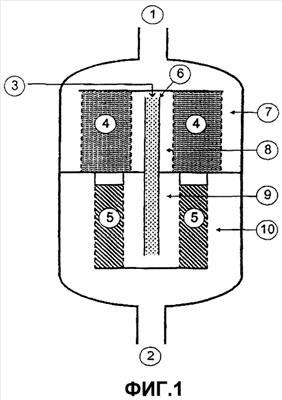 Фиг.6 описывает вариант осуществления, подобный фиг.5, с той разницей, что газ проходит через первый слой (4) катализатора радиально, а через второй слой (5) аксиально. Остальные позиции имеют указанное при описании фиг.3 значение.