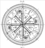 На торцевых кромках восьми донных створок сделаны боковые пазы 48, в которых с чередованием в строгой последовательности вертикально встроены неподвижные (рифленые) опорные валы 49 нечетных створок 29, с насаженными в посадках с зазором полыми трубными уплотнителями 50, фиксируемые в противоположных друг к другу сторонах боковых пазов 48 (без трубных уплотнителей), в подпружиненных 51 замках – защелках (рифленых с внутренней стороны) 52 с тягами 53 возвратного действия второй (-2-), четвертой (-4-), шестой (-6-) и восьмой (-8-) донных створок 29, образующие с первой (-1-), третьей (-3-), пятой (-5-) и седьмой (-7) створками 29 открытый полый конус 46, под большим основанием которого, обращенным книзу (емкости смесителя 6), осуществляется вращение по верхним поддерживающим роликам 54 средней части 10 общей сварной опорной рамы 8, лопастного штампованного диска – разбрасывателя 55 с лопастями 56 и направляющими каналами 57 (двенадцать), с пятью разделительными скребками – треугольной формы 58, прикрепленными к профилю диска 55 вблизи вертикального вала 59.