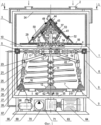 На рабочей поверхности диска 55 исходный материал аккумулируется с образованием определенного взвешенного слоя, внутри которого происходит перераспределение частиц сыпучего материала (в зависимости от величины разрежения), причем лопастям штампованного диска – разбрасывателя 55 передается часть кинетической энергии транспортируемых ингредиентов, благодаря этому лопасти 56 значительно замедляют частоту вращения диска 55 и соответственно емкости вибрационного смесителя 6, что способствует постепенному сходу смешиваемого материала с рабочей поверхности лопастного штампованного диска 55 под действием центробежных сил инерции в направляющие двенадцать каналов 57 лопастей 56, в дальнейшем частицы исходного материала беспрепятственно поступают в емкости 6 смесителя вибрационного типа.