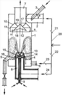 В нижней части аппарата расположена газораспределительная решетка 4 для создания кипящего слоя, патрубок 5 для выгрузки гранул, патрубок 6 для подачи под решетку газа, вертикальный газоподводящий патрубок 8, укрепленный в решетке 4 соосно корпусу 1 и снабженный форсункой 9 для распыливания пульпы (раствора) или расплава. Вертикальный газоподводящий патрубок 8 соединен посредством конуса 15 с поверхностью решетки 4, а коаксиально конусу 15 расположен конус 16 с зазором «t» между ними, лежащим в оптимальном интервале величин: t=(0,01…0,1)D. В решетке 4 прорезаны отверстия для подачи газа в зазор «t» между конусами 15 и 16. Торец патрубка 8 расположен на уровне высоты кипящего слоя, а торец конуса 16 расположен ниже торца патрубка 8. Управление процессом при наличии трех газоподводящих потоков осуществляется через центральную магистраль 20 с использованием заслонок 21, 22, 23, 24, установленных на отдельных ветвях газоподводящих потоков.