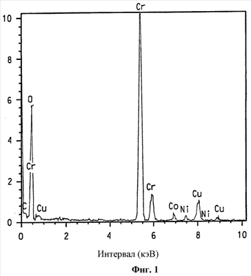 На фиг.1 представлен спектр, полученный спектроскопией с рассеянием энергии, образца смешанного никель- и кобальтзамещенного альфа-оксида хрома, номинально содержащего 3% ат. кобальта и 2% ат никеля.