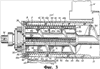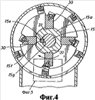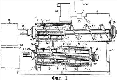 На чертежах буква А относится в целом к устройству в соответствии с настоящим изобретением, которое содержит камеру или корпус (верхний) 10 предварительного измельчения вместе со смежной с ним главной измельчительной камерой или корпусом 12. Корпус 10 имеет входное отверстие 14, в которое может быть загружены неуплотненные медицинские отходы любого происхождения. Сквозь корпус 10 проходит продольный вал 15, который соединен с приводным устройством 16, например электромотором мощностью 60 л.с., приспособленным для продолжительного режима работы. На разрезе по линии 4-4 (Фиг.4) показано, что вал 15 имеет втулку 15а, которая зафиксирована на валу 15 посредством шпонки 15е через шпоночные пазы 15f и 15g. Втулка 15а расположена с левого конца вала 15, как это показано на Фиг.1 и 3. Таким образом, втулка 15а укреплена на левом конце вала 15, и может вращаться вместе с ним, благодаря шпонке 15е, вставленной в шпоночные пазы 15f и 15g. Шнек 15b приварен ко втулке 15а и может вращаться совместно с валом 15, осуществляя подачу неуплотненных медицинских отходов в корпус справа налево, как показано для корпуса 10 на Фиг.1. К корпусу 10 на его левом конце прикреплены один или несколько неподвижных перемалывающих зубьев F, расположенных по окружности, как хорошо видно на Фиг.4. Неподвижные зубья F взаимодействуют с одним или более вращающимися зубьями R, как будет более подробно пояснено ниже. Вал 15 по обоим концам установлен в соответствующих подшипниках 15с, что должно быть понятно специалисту.